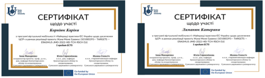 З 19.04.2023 р. по 24.05.2023 р. викладачі кафедри Подолянчук О.А., Іщенко Я.П. прийняли участь в програмі віртуальної міжнародної мобільності «Найкращі практики ЄС-Україна щодо досягнення ЦСР», яка реалізовувалася в рамках реалізації проєкту Жана Моне Еразмус (Проєкт «Transparency. Accountability. Responsibility. Governance. Europe. Trust. Sustainability»).