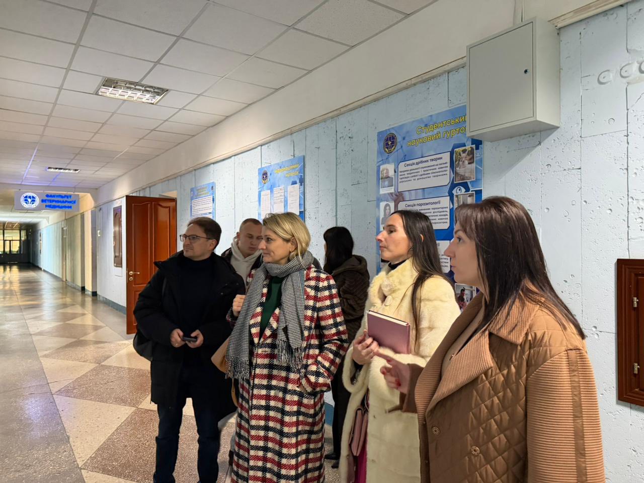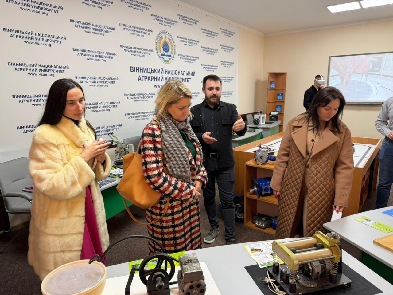Зустріла закордонну делегацію Світлана ЛУТКОВСЬКА, проректор ВНАУ, яка ознайомила гостей зі структурою Університету, його історією та діяльністю факультетів Технології виробництва, переробки та робототехніки у тваринництві та Ветеринарної медицини. Каролін Спаанс надзвичайно зацікавилась сучасними навчально-практичними центрами ВНАУ і навіть долучилася до лабораторної роботи з визначення якості мʼяса на надсучасному обладнанні спільно зі студентами 3-го курсу.