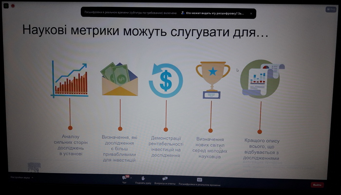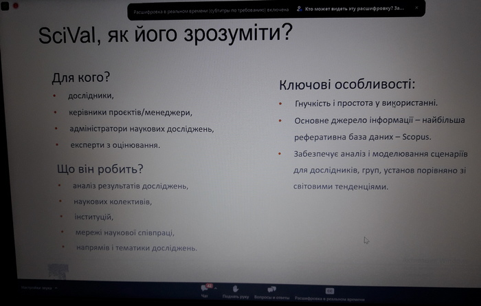 25 жовтня 2022 року відбувся вебінар на тему: SciVal без таємниць – аналіз доробку дослідника та установи. На вебінарі учасники дізналися що таке інструмент SciVal, які його функціональність і можливості, як він може допомогти при аналізі наукового доробку (установи/дослідника/країни).