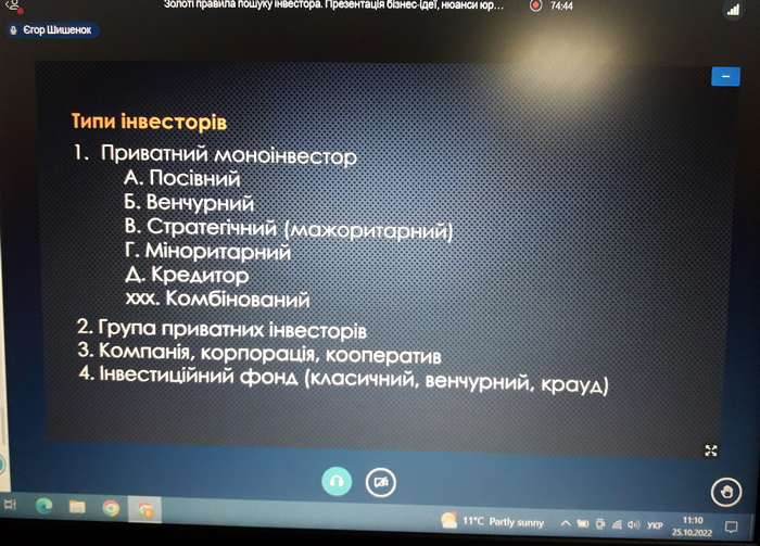 11-00 – «Золоті правила пошуку інвестора. Презентація бізнес-ідеї, нюанси юридичного оформлення домовленостей з інвестором, участь інвесторів у бізнесі та подальша стратегія співробітництва». (Спікер – Єгор Шишенок, Co-Founder Компанії «Якість Гарантовано»).