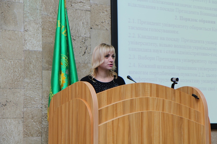 Таїсія Томляк, начальник юридичного відділу університету доповіла про проекти змін до Положення про коледжі щодо надання коледжам ВНАУ права публічних закупівель та зміни до Статуту.