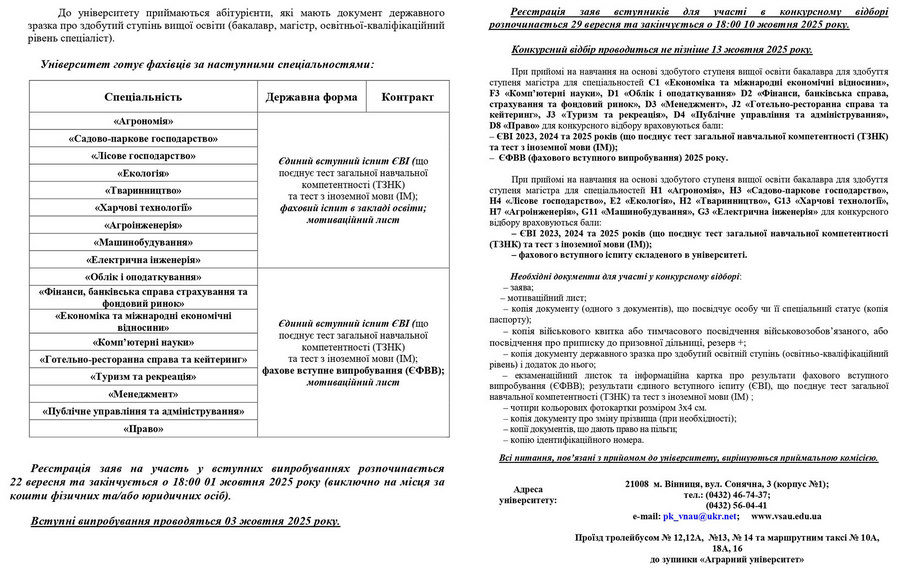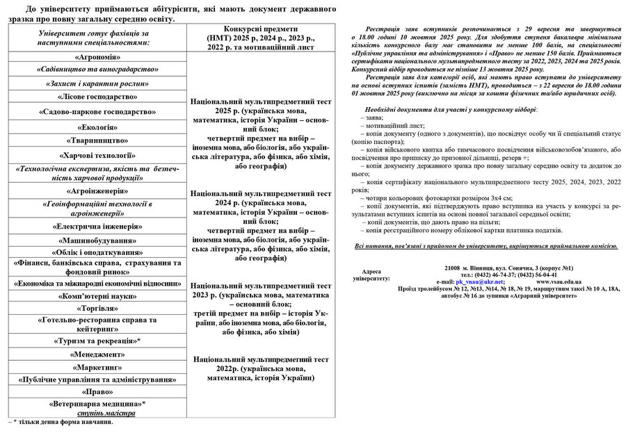 - Приймальної комісії ВНАУ: (0432) 46-74-37, (0432) 56-04-41.