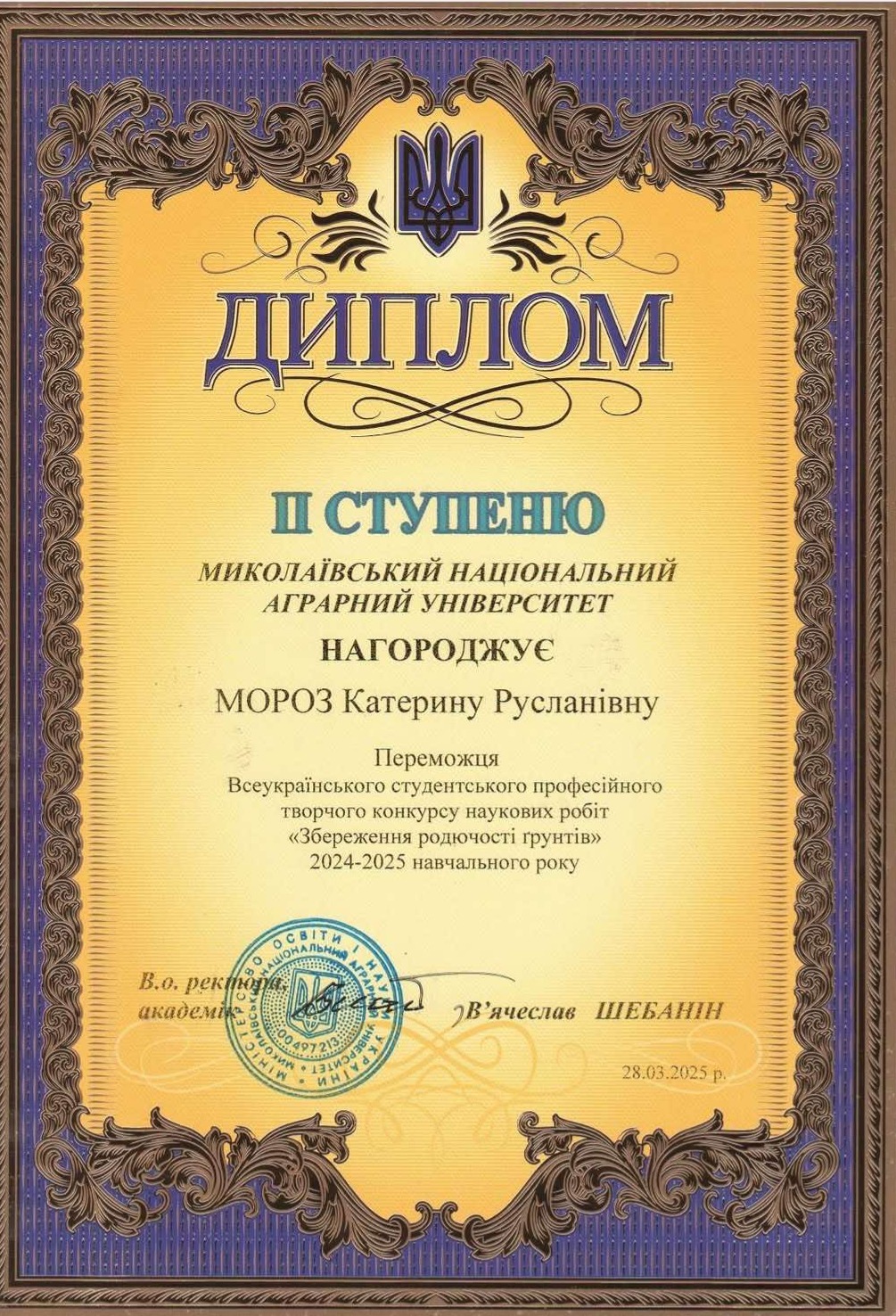4. «Розробка технологій підвищення продуктивності та екологічної безпеки продукції рослинництва в контексті збереження ґрунтів» (2025-2026 рр., № 0125U003274).