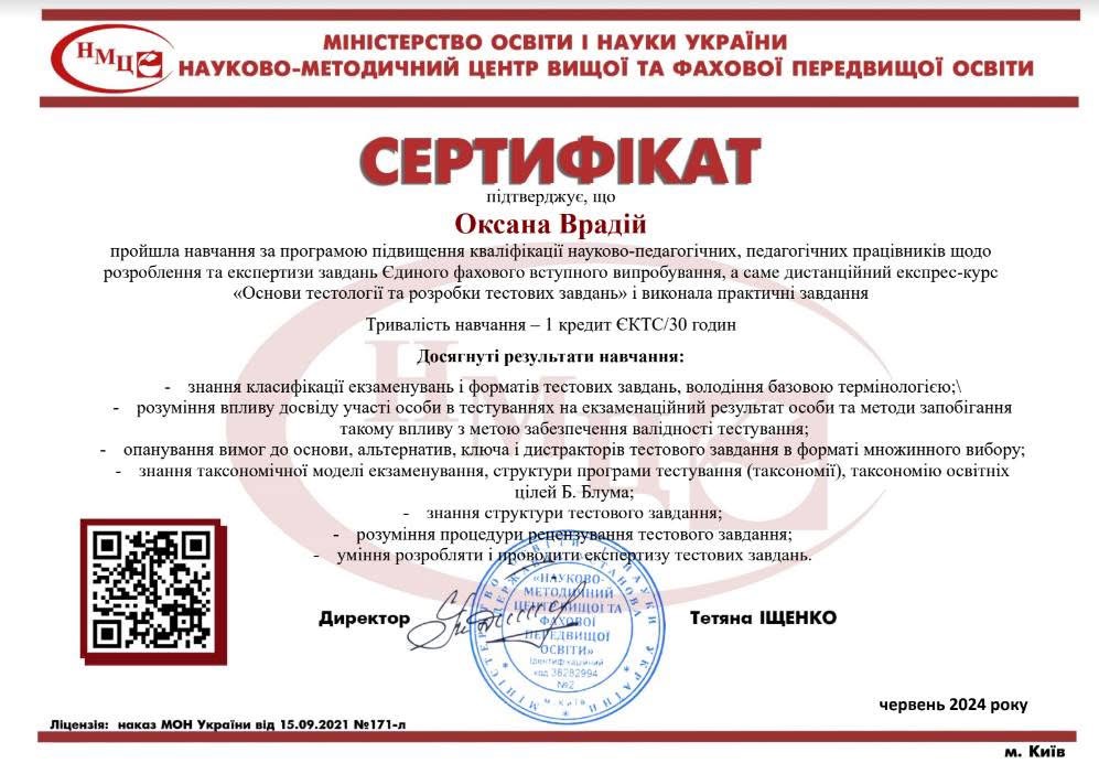 Викладач кафедри екології та охорони навколишнього середовища Врадій О.І. успішно пройшла серію навчальних семінарів, організованих провідною школою англійської мови FLASH. Під час занять викладачем отримано вагомі навики у практичних заняттях, тренінгах з підвищення мовного рівня та освоєння сучасних методик викладання англійської мови. А також навчання за програмою підвищення кваліфікації науково-педагогічних працівників щодо розроблення та експертизи завдань Єдиного фахового вступного випробування (ЄФВВ, Аграрні науки та продовольство), а саме дистанційний експрес-курс «Основи тестології та розробки тестових завдань» і виконали практичні завдання.